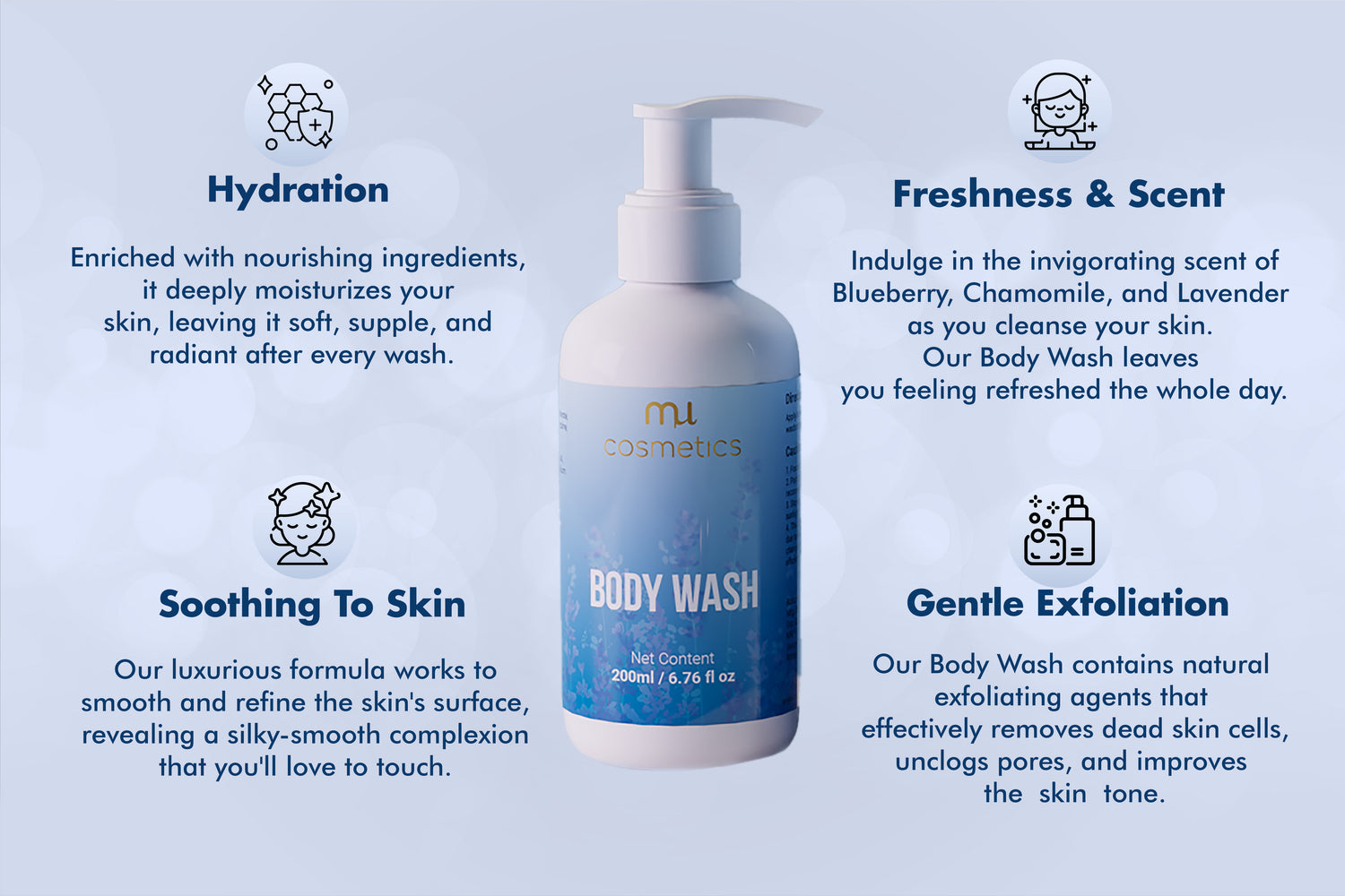 Introducing MU Cosmetics's Body Wash, a luxurious and nourishing formula that combines the natural goodness of Blueberry, Chamomile, and Lavender to provide your skin with long-lasting best smelling experience.