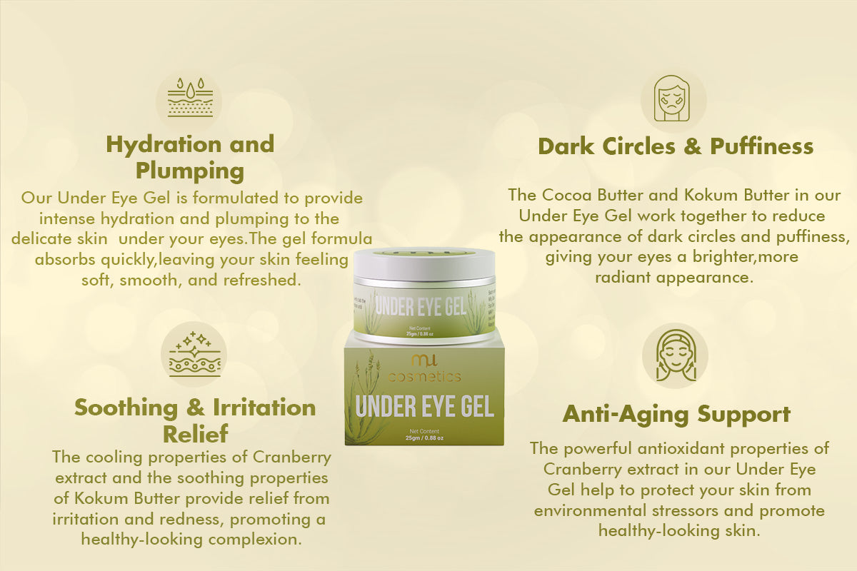 Introducing MU Cosmetics' Under Eye Gel, a rejuvenating powerhouse infused with the natural goodness of Hyaluronic Acid, Niacinamide, Aloe Vera Extract, and Wild Yam Root Extract, delivering targeted care for your delicate under-eye area.